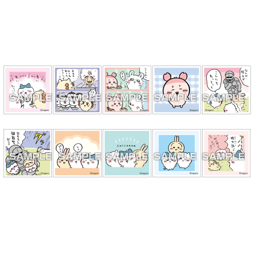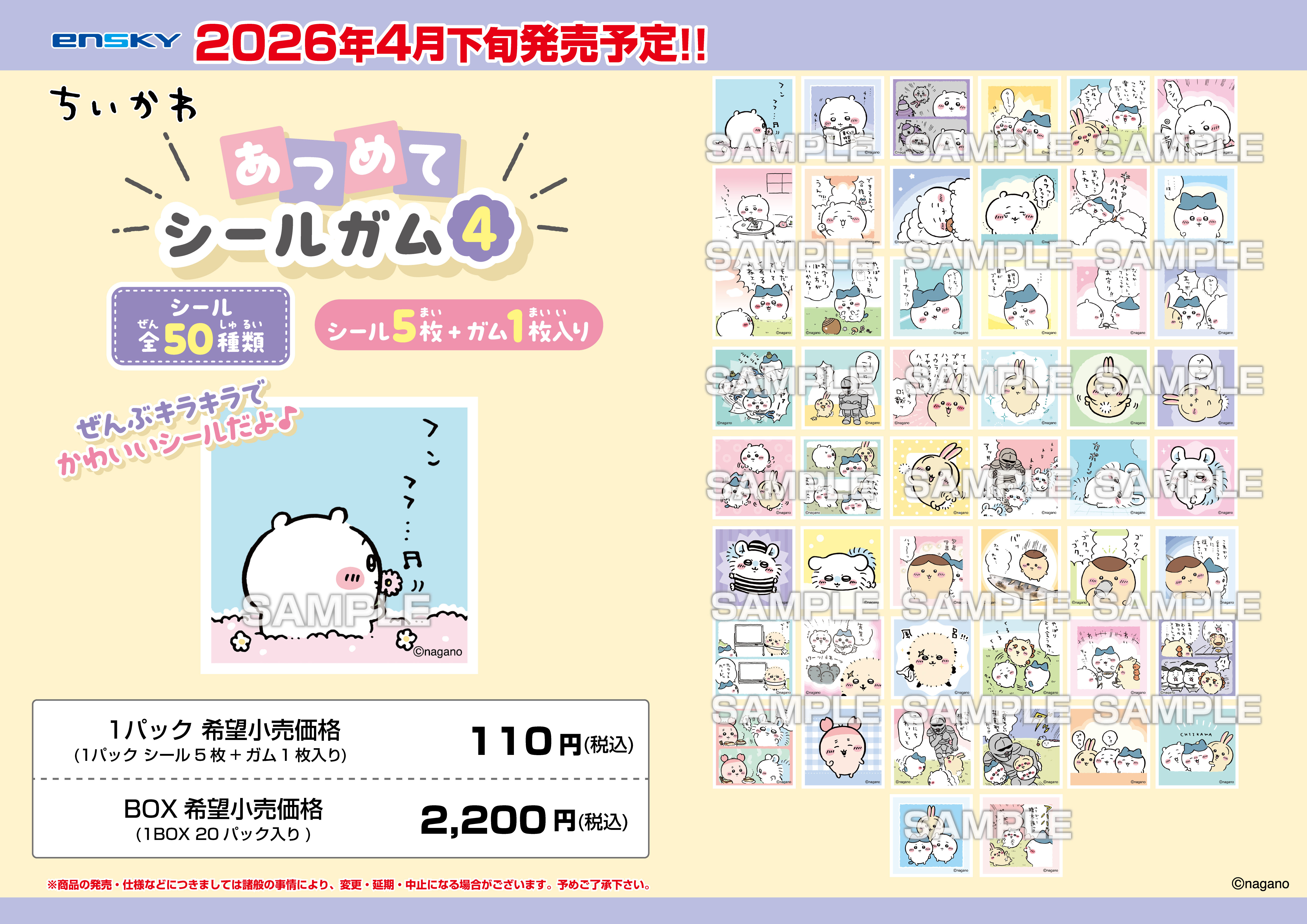 「ちいかわ」からあつめて楽しいシールガム第4弾が登場。52mm角サイズ、表面にキラキラ加工が施されています。シール裏面にもクイズなどのあそびがあります。全50種類。1パックにシール5枚入。