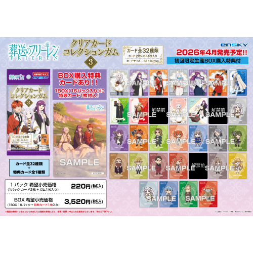 TVアニメ『葬送のフリーレン』からプラ製のクリアカード付きガム第3弾が登場。カードサイズ63mm×89mm。全32種類。1パック2枚入。