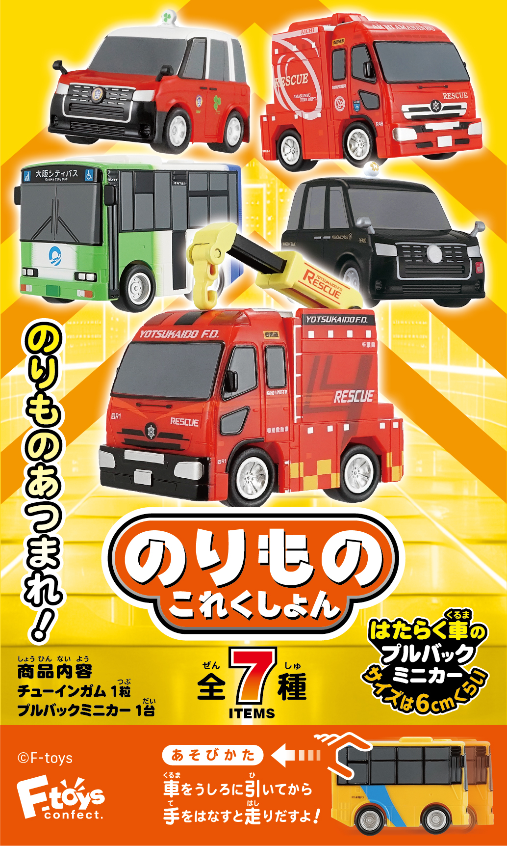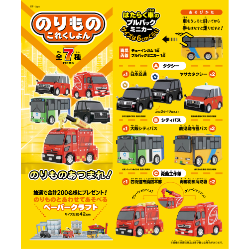 プルバックカーシリーズ第20弾。街でよく見るあのタクシー&バスが登場!全7種類。