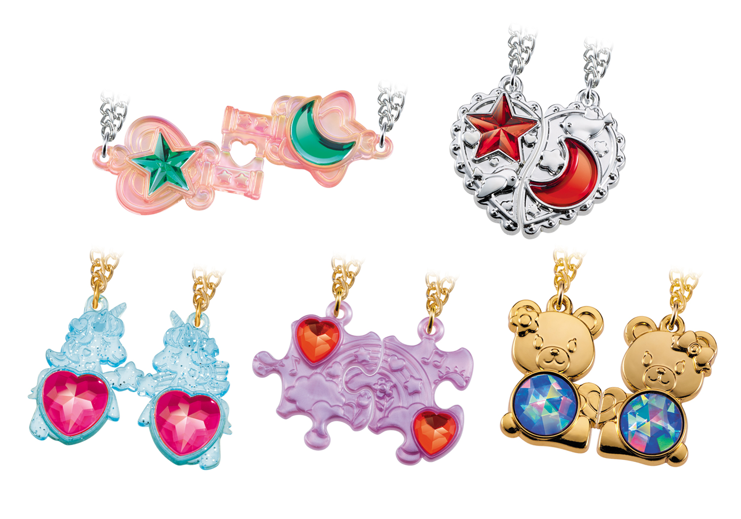 今回はペア仕様のペンダント2個セットで、様々な形状及びカラーのキラキラ可愛い魅力的なデザインによってお揃いコーディネートが楽しめます。