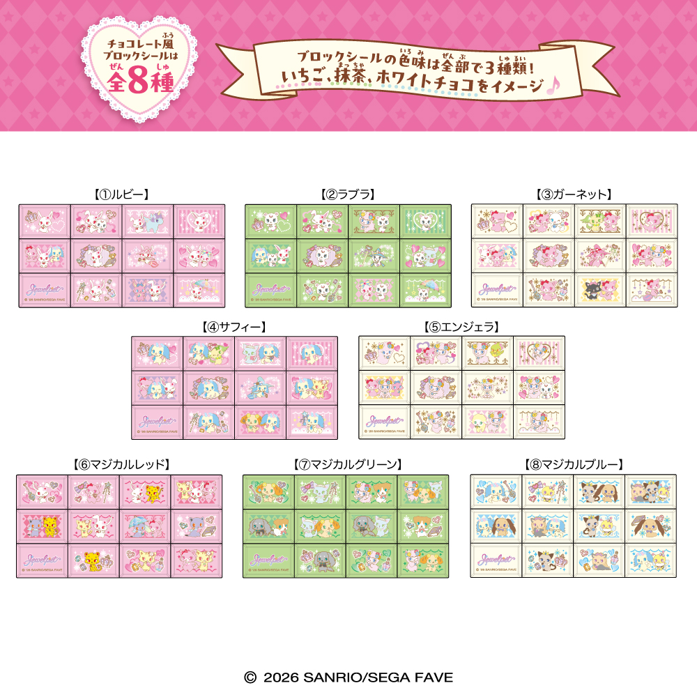 ラインナップは1シート12柄で全8種。ジュエルペットたちのマジカルなちょこぶろっくしーるをぜひ手に入れてね♪