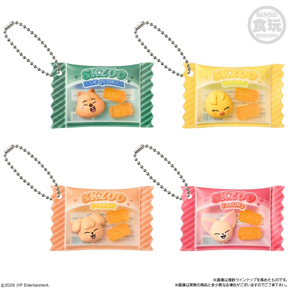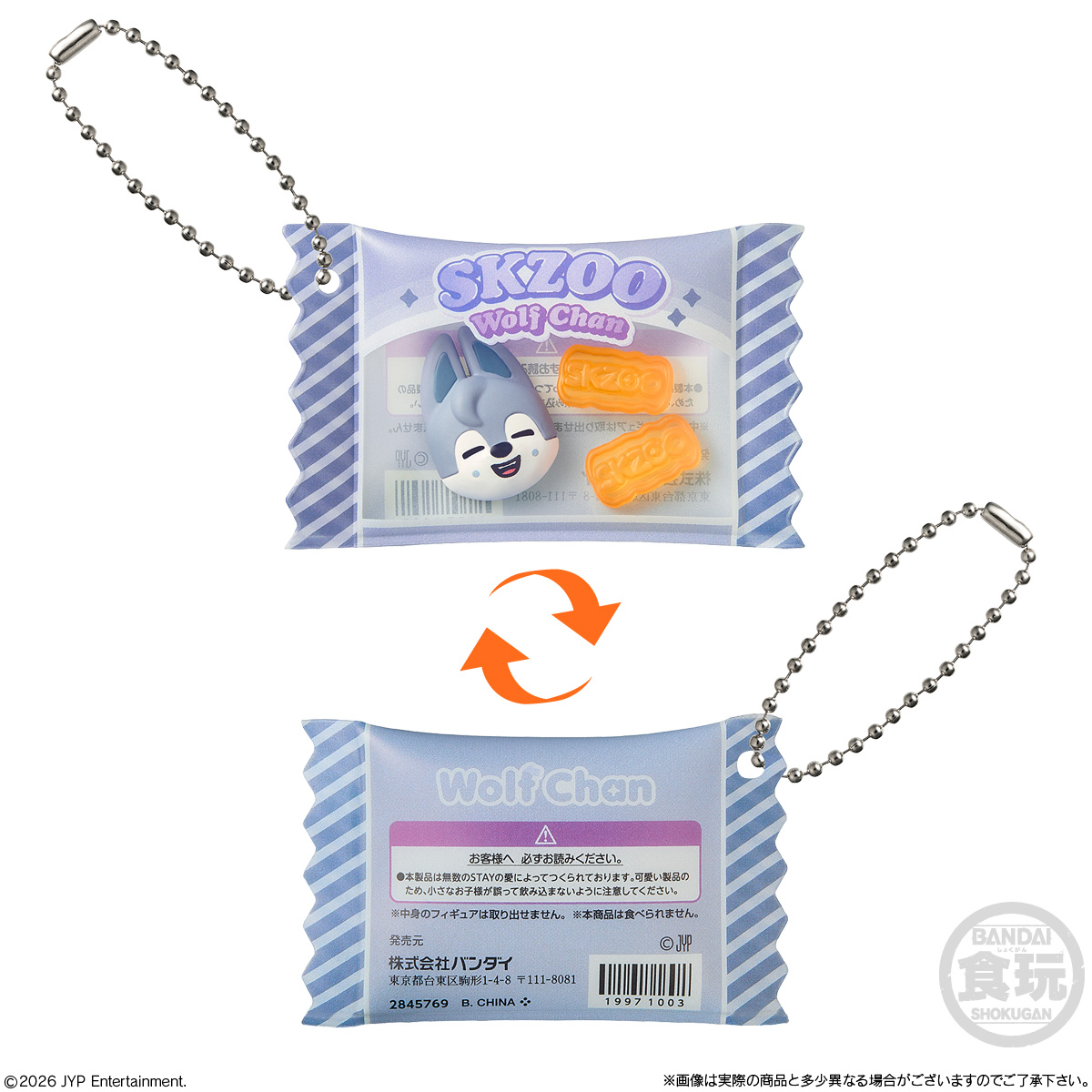 お菓子パッケージ風のチャームには『SKZOO』のマスコットとグミ型マスコットが入っていて、