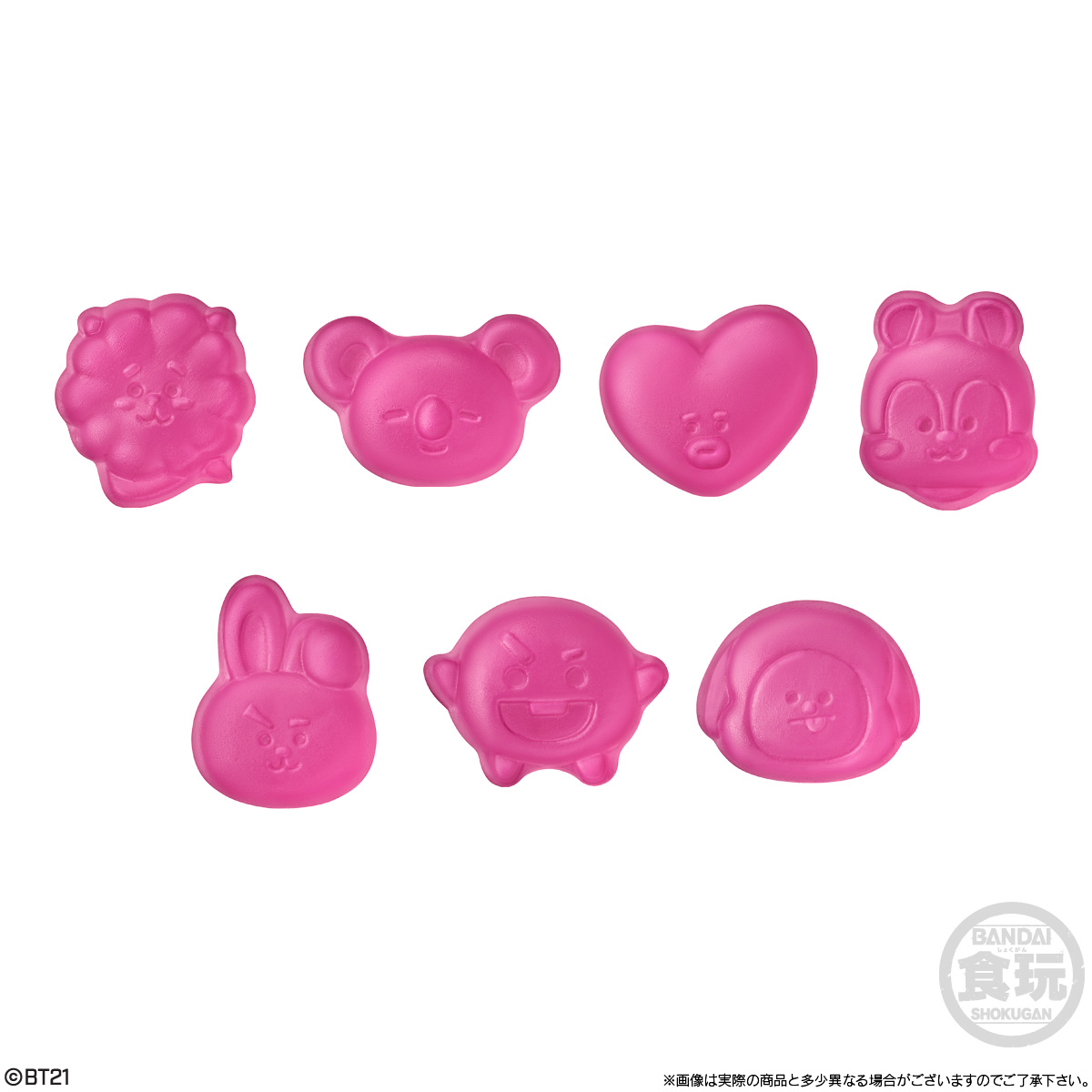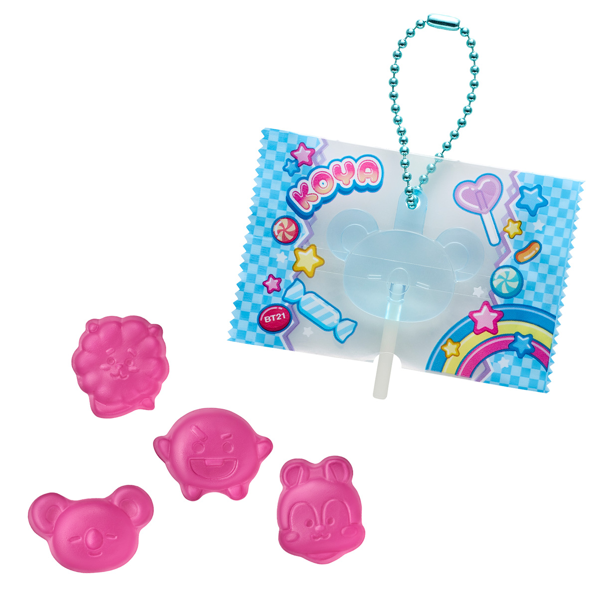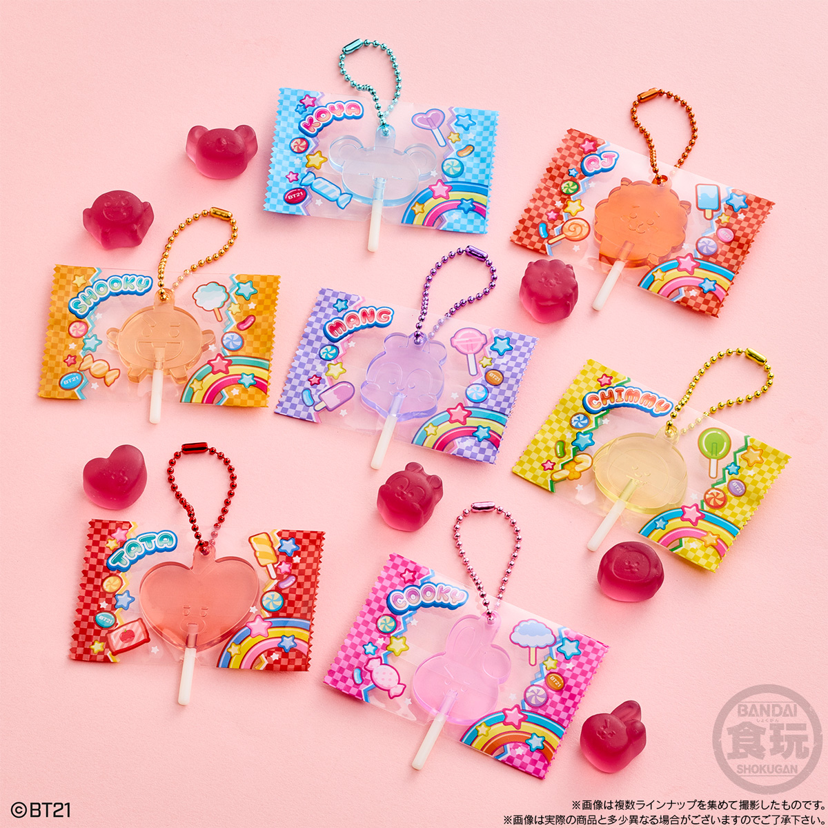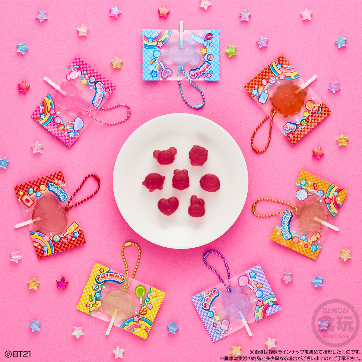 BT21たちの形をしたグレープ味のグミに、ペロペロキャンディ風チャームが1個付きます。