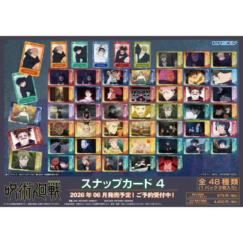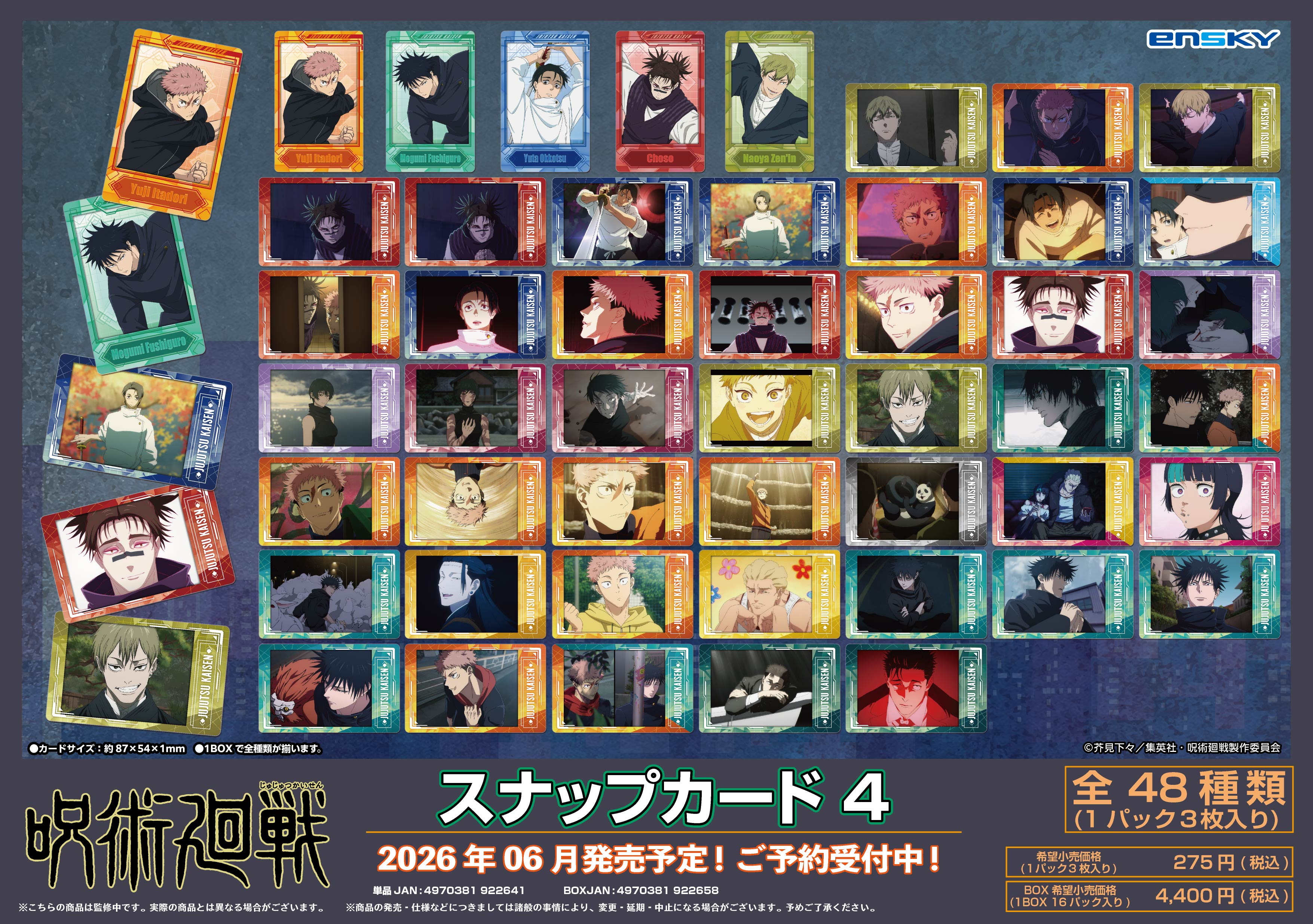 TVアニメ『呪術廻戦』より、「スナップカード」の第4弾が登場!描き下ろしやアニメ場面写などを使用した、スナップ写真のようなミニサイズのブロマイドコレクションです!